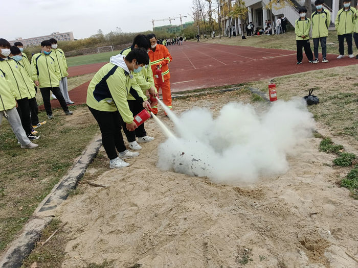 消防灭火演练安排在指定地点进行,学校安保人员及义务消防员悉数到场。校安保处安全员向同学们介绍了消防安全知识,如油锅起火、燃气灶具起火扑救的处置方法。同时,安全员对灭火器的使用方法作了详细讲解,要求同学们遵循“小火扑救,大火逃离”的原则,并演示了初起火灾时如何扑救。随后,同学们纷纷拿起灭火器亲自上阵,活动达到了较好的演练效果。