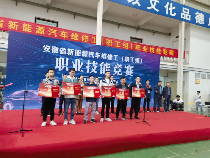 本次比赛是安徽省一类行业赛,分为新能源汽车理论知识考试和新能源汽车车身系统故障诊断与排除两部分,比赛项目基于新能源汽车电动化,对接新能源汽车企业先进技术、国家标准和行业标准,考查选手对新能源汽车电动化技术和实际操作技能的掌握能力。来自全省15个地市的28名选手齐聚赛场,同台竞技。经过两天紧张角逐,最终马鞍山市选手袁同帝获得第一名,来自合肥市选手赵保义获得第二名。