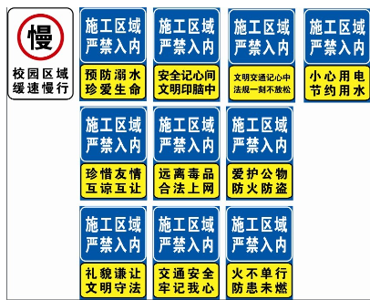 皖江职业教育中心学校,施工场所环绕教学区、实习区。鉴于安全考虑,学校特设置安全警示牌10块,限速牌3块,由协约广告公司承办。