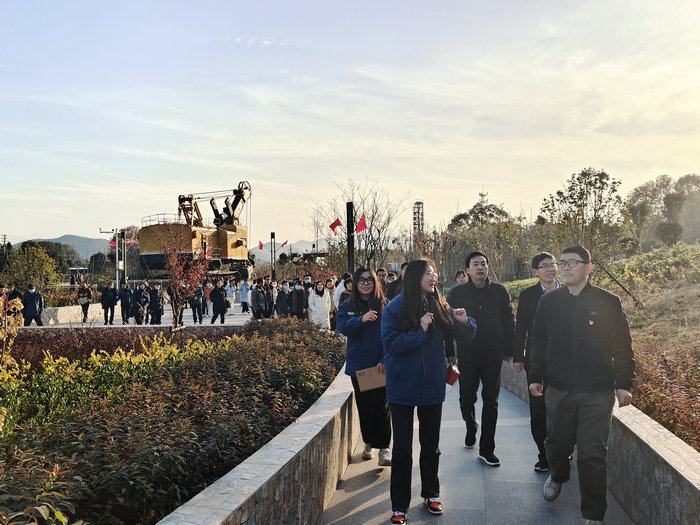凹山湖位于马鞍山市雨山区向山镇境内,其前身具有百年开采史、被誉为“马钢粮仓”“功勋矿山”的南山矿主体矿山——凹山采场。在讲解员的带领下,党员干部看到了曾经的功勋战士:推土机、3307运矿车、WK-4电铲、3310牙轮钻和150电机车,感受着曾经“华东第一矿”的风采。随后,参观了凹山历史文化展示区,通过凹山松、“源”石、展板等人文景观建筑和图文历史资料等,了解了矿山地质知识、采矿遗迹、历史故事等丰富多彩的内容,沉浸式体验那段火热年代的感人故事。在凹山松旁,全体党员面对鲜红党旗,举起右手,握紧拳头,重温了入党誓词。